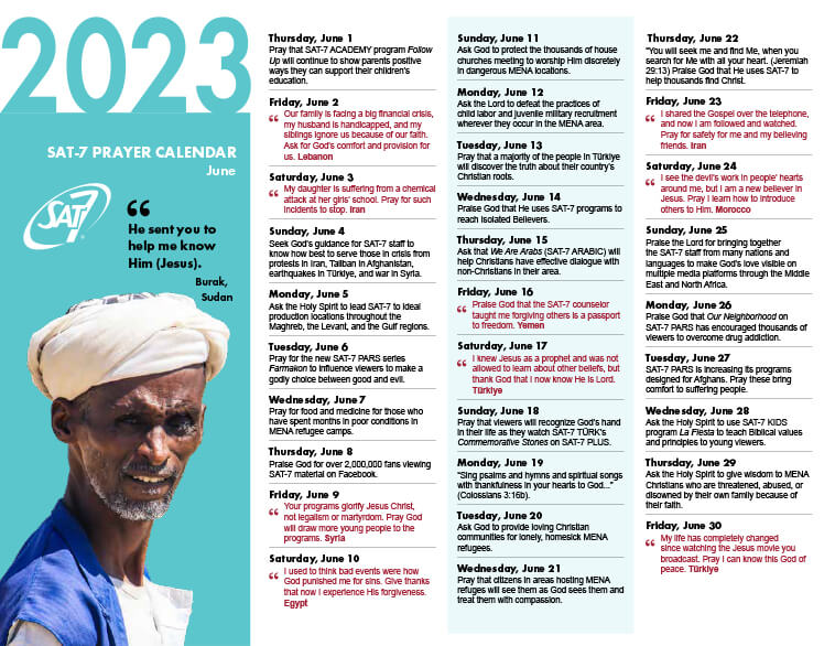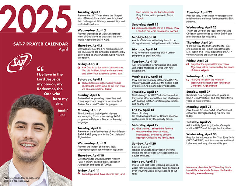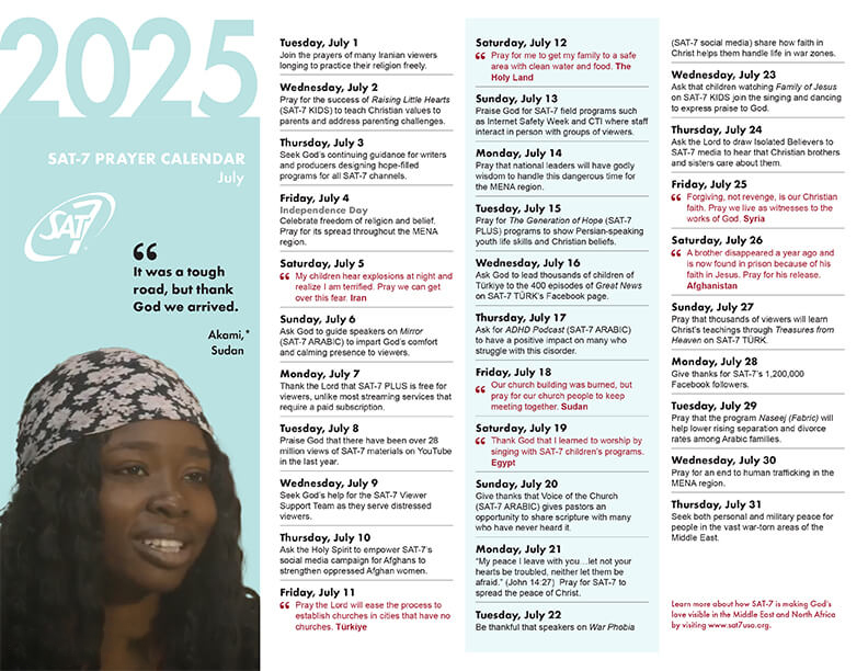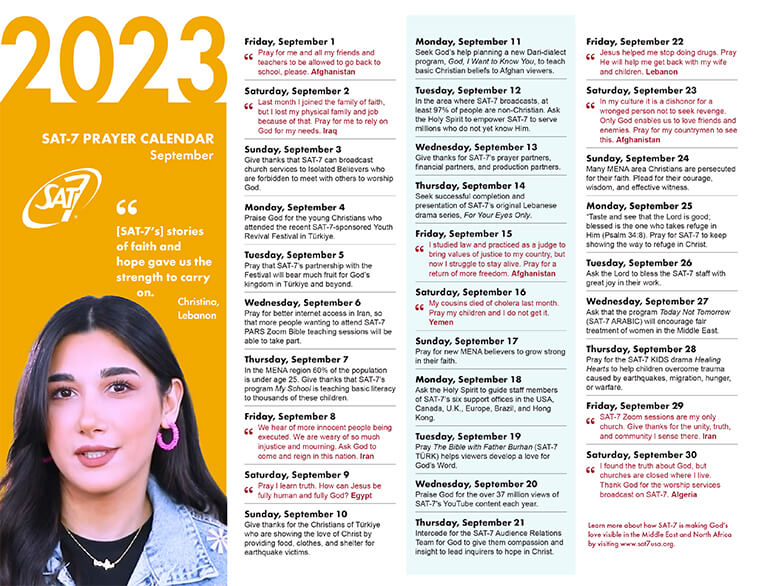 Your prayers are important to us! In addition to joining our monthly prayer calls, you can fill out the form below to receive a monthly Prayer Calendar with daily prayer points on our programs, viewers, and staff. You can share this with your small group, church, and friends to promote prayer for our brothers and sisters in the MENA.