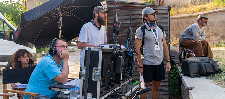 Director Ali Kerem Gülermen (left) with the crew filming a scene for Yakamoz.