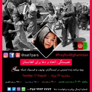SAT-7 PARS invites viewers to tune into a time of live intercession tonight (Aug 17). There will be prayers for unity, peace, security, and hope, as well as sharing prayer requests from Christians in Afghanistan.
